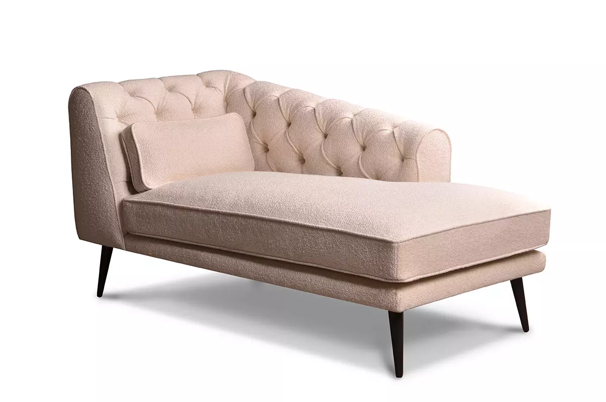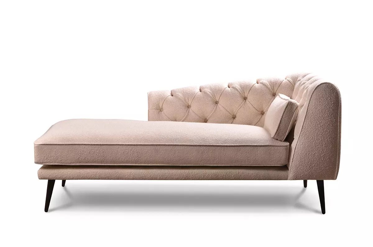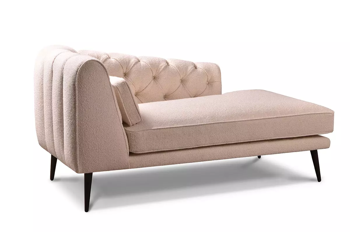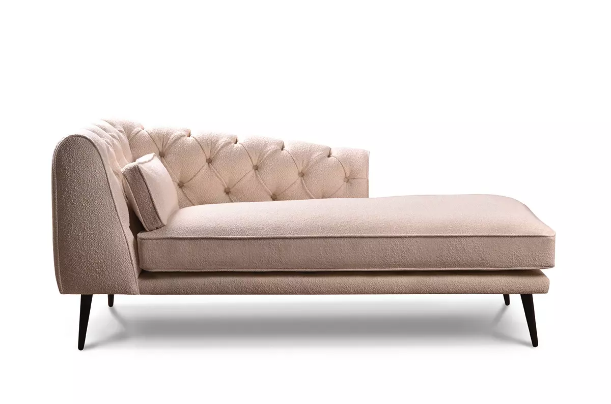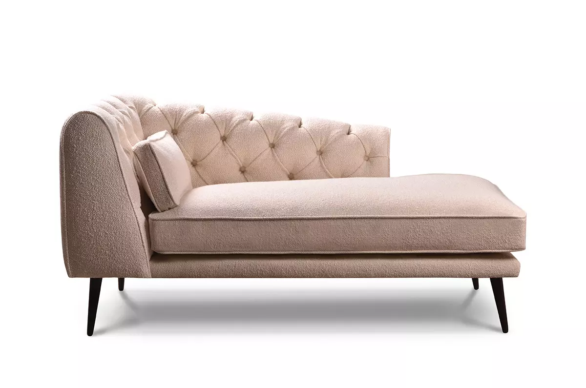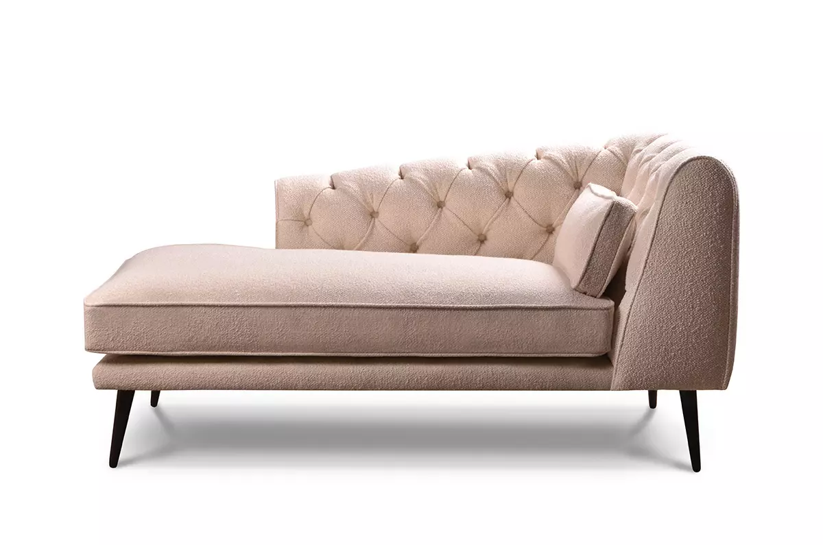 Szezlong Franco przyciąga uwagę ozdobnymi pikowaniami i prostymi przeszyciami na plecach. Dodatkowa poduszka wspiera idealnie część lędźwiową kręgosłupa. Wysokie, proste nóżki dodają nuty luksusu. Ten tapicerowany szezlong jest idealnym uzupełnieniem eleganckiego wnętrza, od salonu po sypialnie.