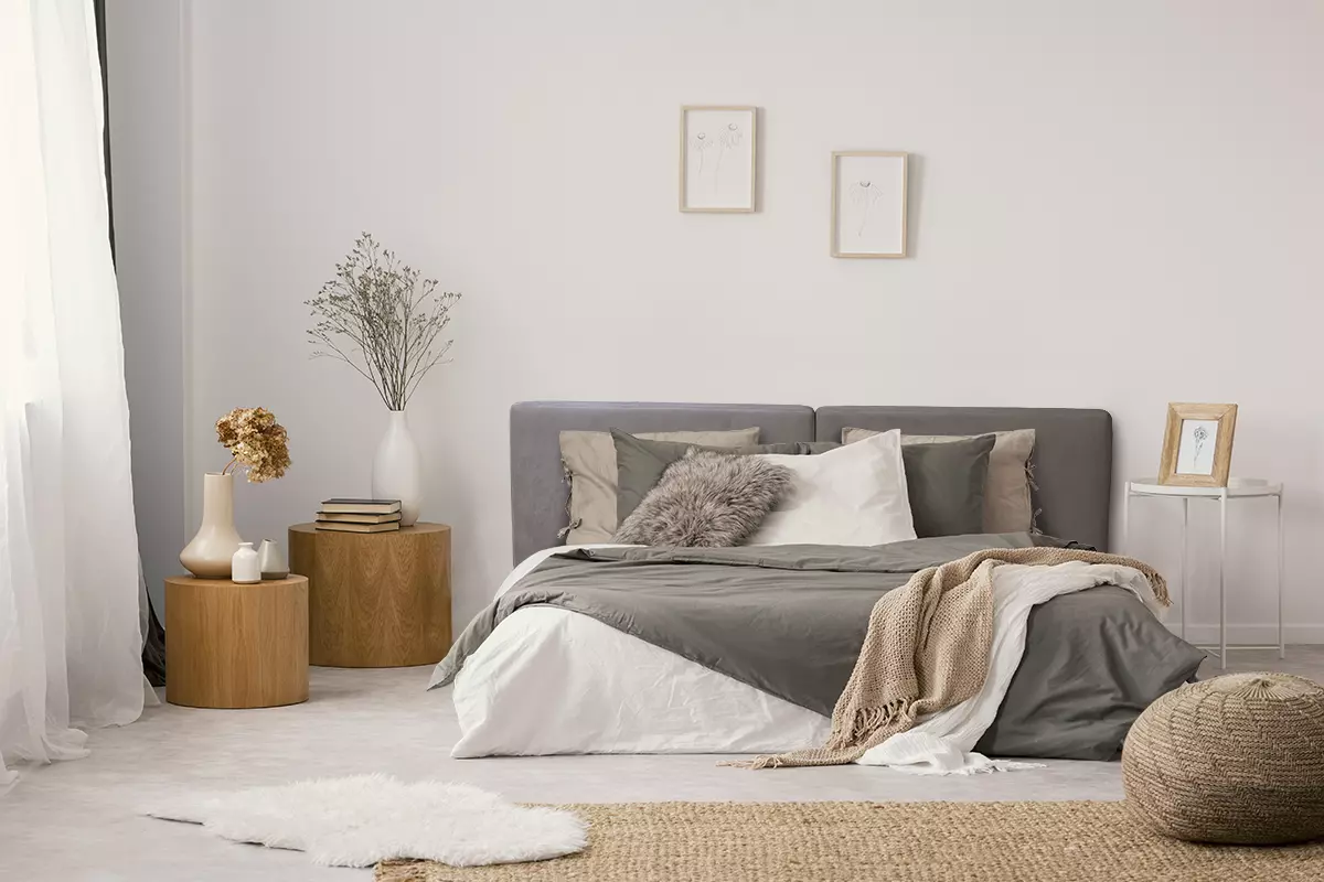 Punktem centralnym każdej sypialni jest łóżko. Najlepiej sprawdzi się takie w stonowanej barwie, które można dopełnić wzorzystymi poduszkami lub pledem. Jasne zasłony i miękki dywan doda przytulności.